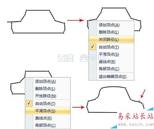 1、插入——形狀——任意多邊形,在文檔中繪出小車的大致形狀,對該形狀右鍵——編輯頂點。