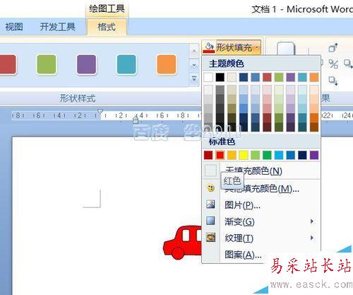 4、按住shift鍵選擇車體和車輪,繪圖工具——格式——形狀填充,為其填充上紅色。選擇小車所有部分,右鍵——組合。