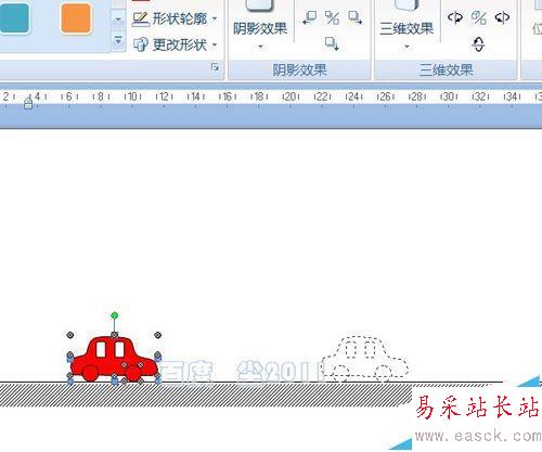 7、按住shift鍵,用直線工具在矩形上方拉出地面的實線。選擇小車,按住shift鍵拖動一角的變形點向內,使其同比例縮小。按住Ctrl鍵拖動,復制一輛小車。