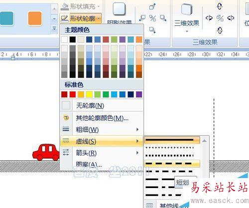 8、按住shift鍵,用直線工具在第二輛小車前方拉出一條直線,形狀輪廓——虛線——短劃線。