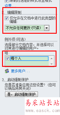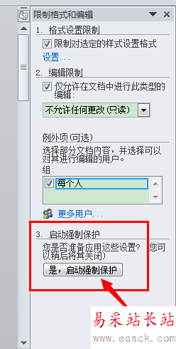 4、隨即在“編輯限制”中勾選“僅允許在文檔中進行此類型的編輯”,此時例外項可以編輯,這里將“每個人”勾選上,意味著所有打開此文檔的人都可以進行為保護的區域編輯。