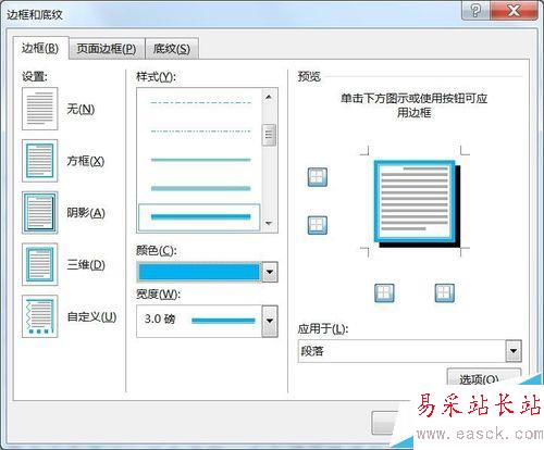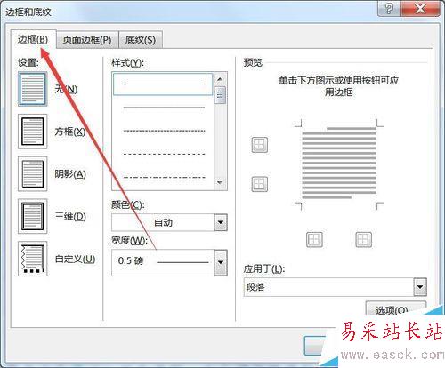 4、在彈出的“邊框和底紋”對話框中選擇“邊框”選項卡