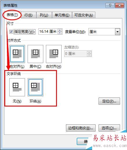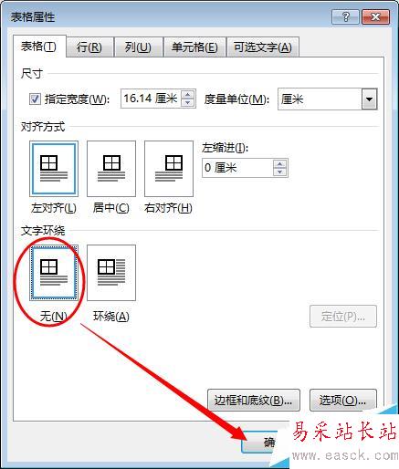 3、彈出【表格屬性】對話框,默認顯示【表格】選項卡,看到下方【文字環繞】位置下方 【環繞】處于選中狀態。這里就是問題的根源所在。點擊左側的【無】然后 單擊 確定 按鈕關閉窗口。