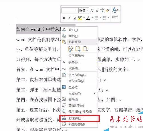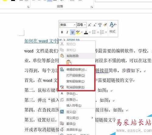 5、設置好后,下次可以直接選擇超鏈接文字,右鍵單擊,選擇打開或者取消超鏈接,如圖