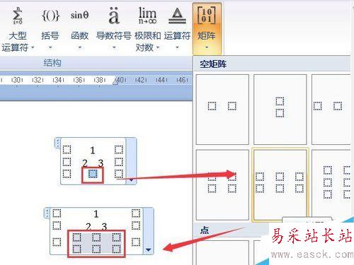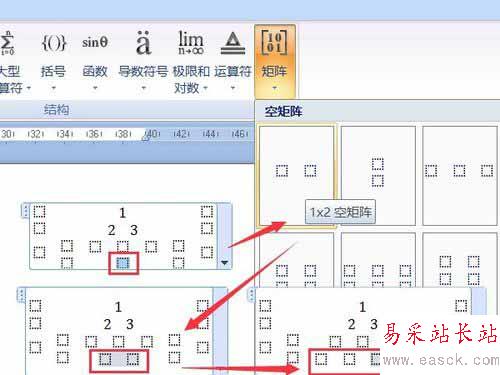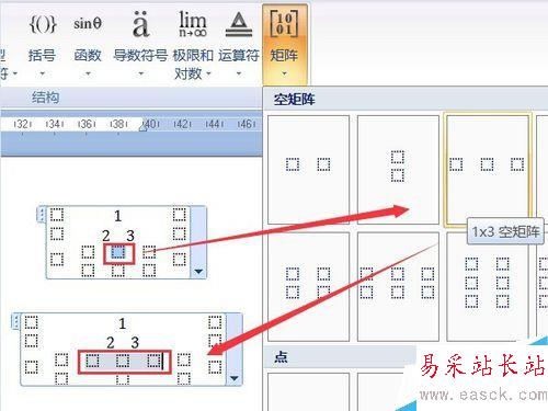 5、然后,選擇新矩陣中間一格,在矩陣列表中選擇“1×3空矩陣”,將此行變為五格。