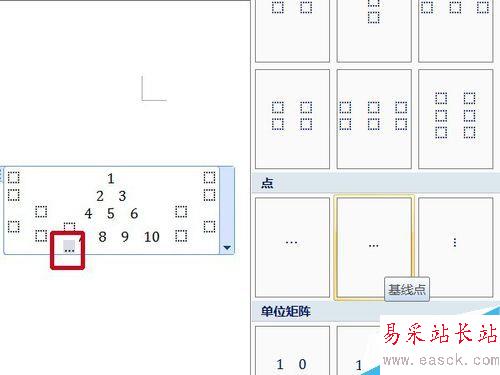 2、點擊“矩陣”下拉箭頭,這里最多的就是3×3矩陣,選擇它。在第一行中間輸入“1”。