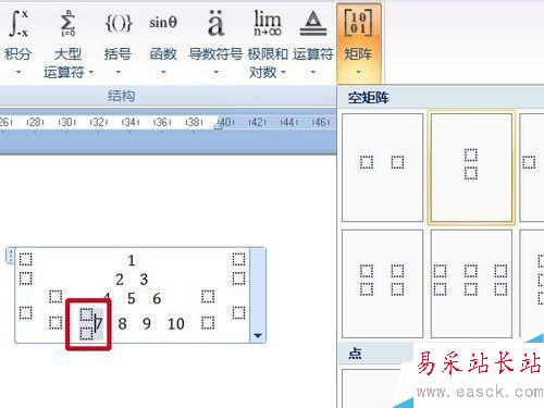 6、選擇第四行中間一格,矩陣列表中選擇“1×2空矩陣”,在選擇新增加的兩格,分別使用“1×2空矩陣”,最終將此行變為六格。