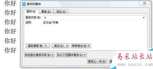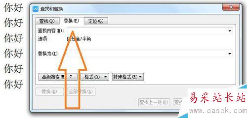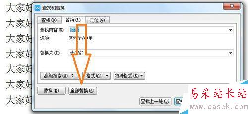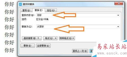 5、在“替換為”中輸入“大家好”(也就是你要將原文字換成新的文字,輸入里面)