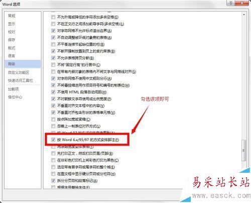 4、在選中“高級”選項后,在右側找到“兼容性選項”。在其子內容中找到“按word 6.x/95/97的方式安排腳注”,勾選該內容。