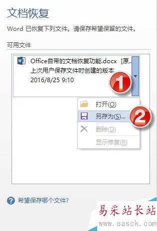 進(jìn)入文檔恢復(fù)對(duì)話框,會(huì)顯示所有可恢復(fù)文件的文件名清單,點(diǎn)選需要恢復(fù)的文件,點(diǎn)擊文件右側(cè)的下拉菜單按鈕,選擇“另存為”保存文件,或選擇“打開(kāi)”直接打開(kāi)該文件。