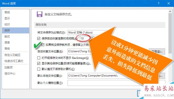 通過(guò)在Office軟件的“選項(xiàng)”窗口中設(shè)置開(kāi)啟自動(dòng)保存功能并設(shè)置自動(dòng)保存的時(shí)間間隔,縮短自動(dòng)保存時(shí)間(如1分鐘),盡可能保存最多的文件信息。此外,請(qǐng)選中“如果我沒(méi)保存就關(guān)閉,請(qǐng)保留上次自動(dòng)保留的版本”復(fù)選框。
