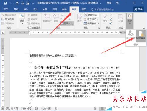 2、在打開的Word文檔窗口中,打開菜單欄的“審閱”選項卡,在審閱菜單選項卡中依次點擊“保護-->限制編輯”選項命令。如圖所示;