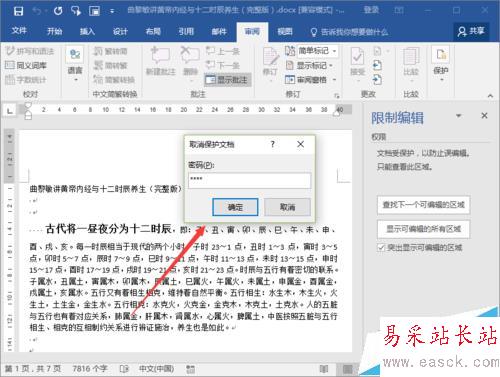 5、在打開的取消保護文檔對話框中,輸入設置的保護密碼,再點擊“確定”按鈕。如圖所示;