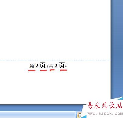 系統將會自動生成頁碼,但并不是我們想要的效果,在斜線前面那個數字的前面輸入“第”在該數字后面輸入“頁”,在斜線后面那個數字的前面輸入“共”在該數字后面輸入“頁”。