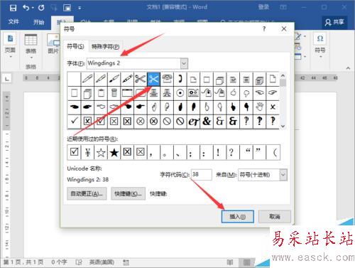 6、在打開的符號對話窗口中,字體選擇Wingdings,在這里面可以看到“剪刀”符號的。選擇它,然后再點擊“插入”按鈕。如圖所示;