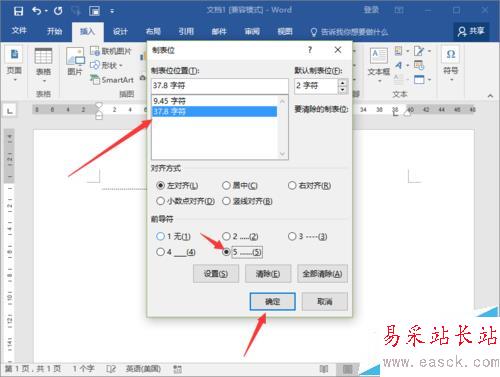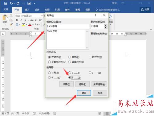 3、在打開制表位對話框中,選擇制表位的位置,在前導(dǎo)符中選擇樣式【5】,然后再點擊“確定”按鈕。如圖所示;