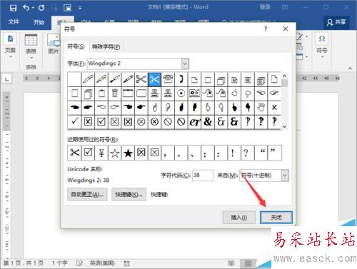 7、剪刀符號插入之后,然后再點擊“關(guān)閉”按鈕,關(guān)閉符號對話窗口。如圖所示;