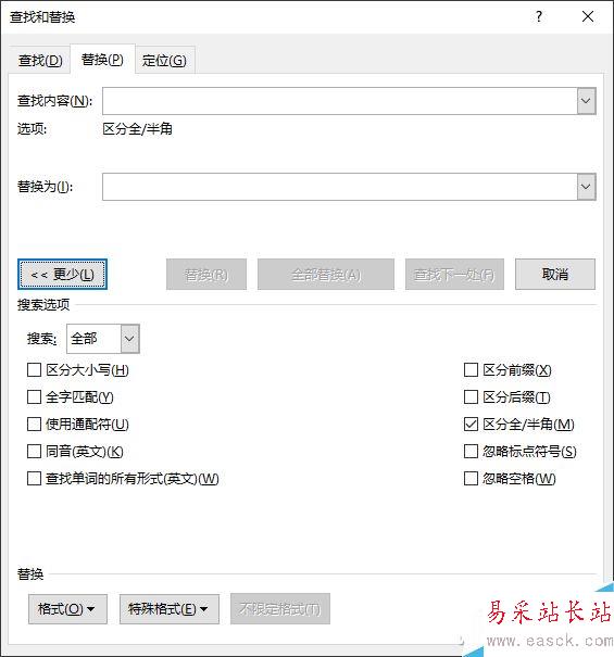 第1步:在Word 2016打開上述的《紅樓夢》文檔,然后按Ctrl+H鍵調出“查找與替換”對話框,點擊下方“更多”按鈕將窗口展開。