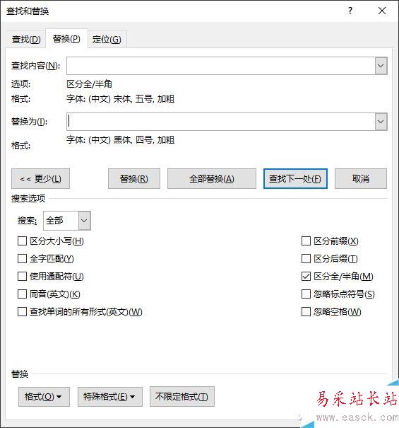 第4步:接下來將光標置入“替換為”文本框中,同上點擊“字體”,然后設置想要的字體。本例為了讓回目更突出,選擇替換為黑體,四號字。此時在替換對話框中,將顯示原格式和要替換的格式信息。點擊“全部替換”即可將所有五號加粗的宋體格式,替換成四號加粗的黑體格式啦。