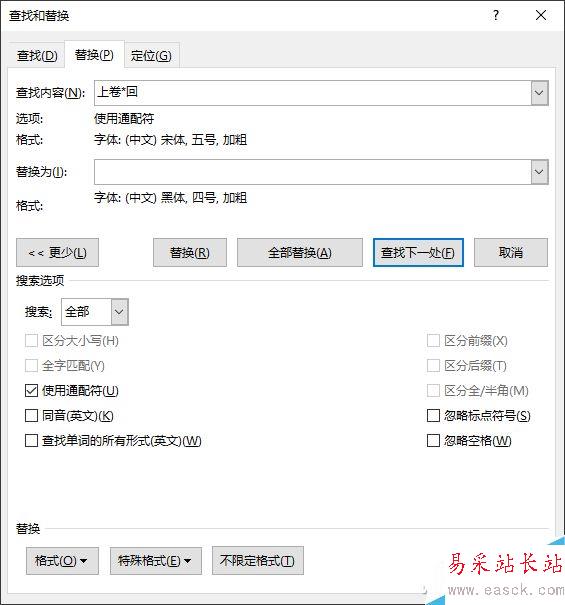 觀察“上卷 第XX回”,可以看出前面的“上卷”和后面的“回”是固定的,變化的是中間部分,所以我們在查找和替換對話框中,先勾選“使用通配符”項,然后保持上述所做的格式替換的那些設置,最后在查找內容中添加一個搜索條件,本例為“上卷*回”,星號就代表了變化的部分。設置完畢點擊“全部替換”,這樣就更加精確了。