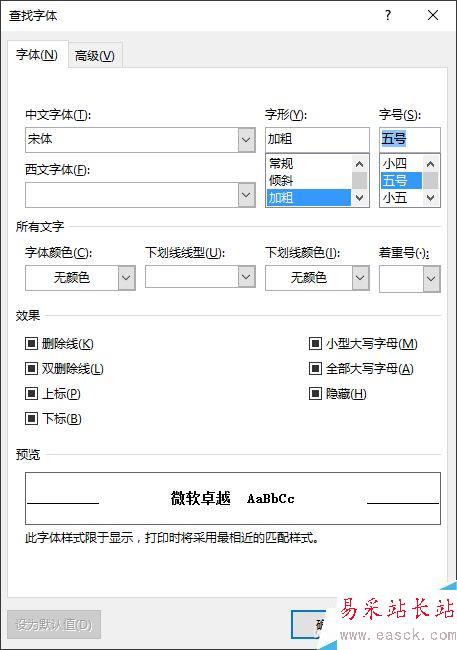 第2步:先將光標置入“查找內容”文本框中,然后點擊下方的“格式”,從彈出列表中點擊“字體”。在打開的查找字體窗口,選擇需要查找的字體,比如本例要查找的是中文字體宋體,字形為加粗,字號是五號。設置好后點擊“確定”返回。