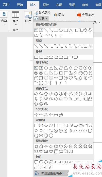 接下來小編以Word 2016為例,但實際上Word 2007/2010/2013中的操作基本差不多。切換到“插入”選項卡,點擊“形狀”,從下拉框的最底部點擊“新建繪圖畫布”創建一個畫布。這一步其實可以省略,不過它方便以后給流程圖設置背景色,進行美化。