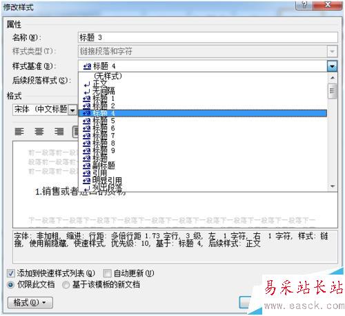 4、點擊“修改”選項,會彈出“修改樣式”對話框,“樣式基準”下有很多默認格式可供選擇。
