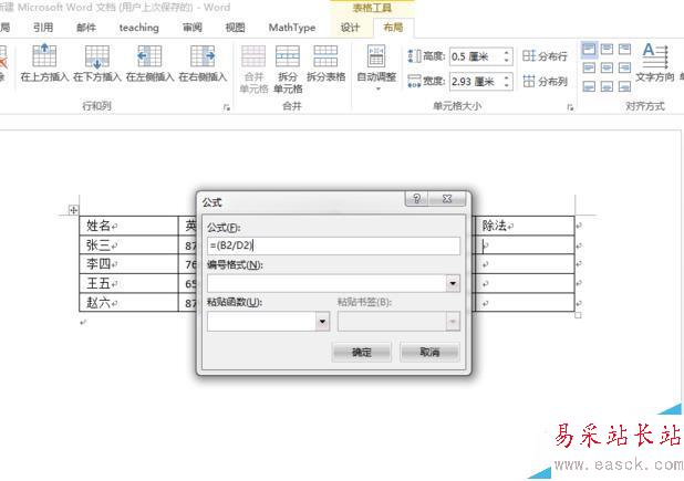 5、點擊“公式”之后,在彈出的對話框中輸入數據。除法直接用“/”即可表。B2:D2是我選擇的區域的數據范圍,表示我要求的是B2、C2、D2這三個數相除。