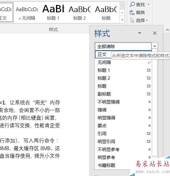 再點擊開始切換選項卡,選擇工具欄右側字體下方的“樣式”,然后點擊光標到文檔上任意位置,全選(Ctrl+A)然后點擊側邊彈出“樣式”菜單中的“全部清除”,這樣所有文檔的格式內容都將被清除,方便大家重新編輯整理標題、小節(jié)、重點等。