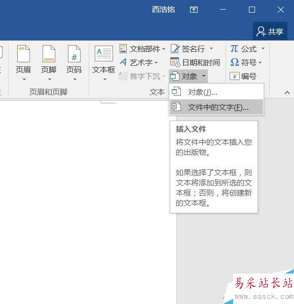 在工具欄最右側選擇“對象”中的“文件中的文字”,在彈出窗口中定位要合并的Word文件(放在同一個文件夾內)。