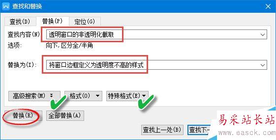 按下Ctrl+H組合鍵,輸入查找內(nèi)容和替換為的內(nèi)容,執(zhí)行替換即可。同樣也可以構(gòu)造高級或特殊格式的查詢和替換條件。