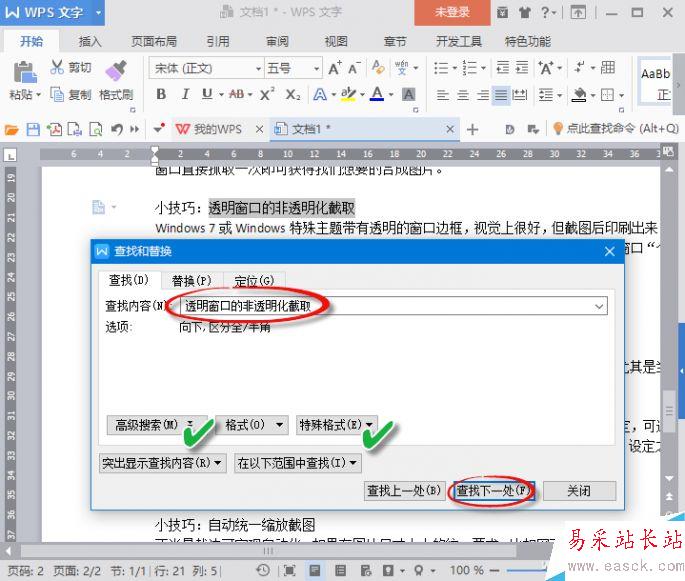 注:本文以WPS截圖,Word中的操作類似。其中Word中雖在“開始→編輯”一欄中標示了Ctrl+F為文件內(nèi)容查找的快捷鍵,但當按下該功能組合鍵后顯示如下界面,搜索面更廣。