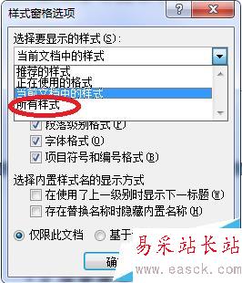 3、點擊“選項”后,會彈出一個樣式窗格選項窗口,在窗口的上方的下拉列表框中有一些選項,我們選擇那個“所有樣式”,如圖中的圓圈位置所示。然后點擊窗體的“確定”按鈕,窗體同時自動關閉。