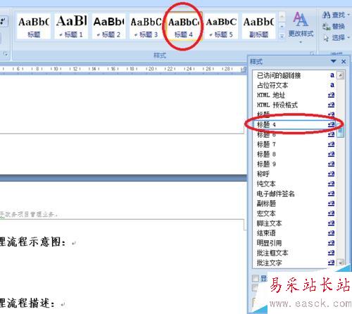 4、返回到樣式窗體列表中,會發現列表中多了“標題4”及其他更多的樣式項,把你想要增加到樣式功能區的樣式項,用鼠標點擊一下,即會將樣式項增加到樣式功能區了。圖例中,正是增加了“標題4”??梢钥吹綐邮焦δ軈^中同時增加了“標題4”樣式。