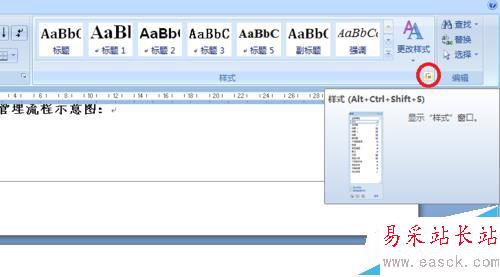 1、在word2007樣式功能區的右下角位置,有一個小圖標,位置如圖中圓圈圈出的位置,鼠標移動到那個位置上的時候會有一個小的預覽窗體,就是要彈出的窗體的預覽啦,而鼠標點擊一下會彈出一個樣式窗體。這里,我們要點擊一下,彈出這個窗體來。