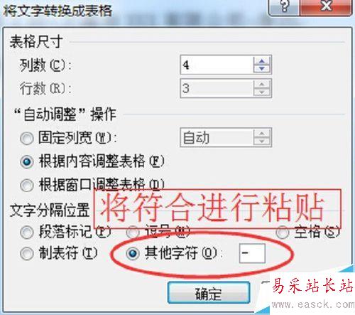 7、點(diǎn)擊插入表格——文本轉(zhuǎn)換成表格。這一步有點(diǎn)區(qū)別了,在設(shè)置分隔符位置的時(shí)候,將之前復(fù)制的符號(hào)粘貼在其他字符的方框中,點(diǎn)擊確定即可。如下圖