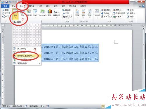 3、點(diǎn)擊菜單欄的插入——插入表格——文本轉(zhuǎn)換成表格;如下圖: