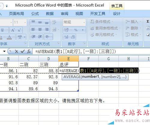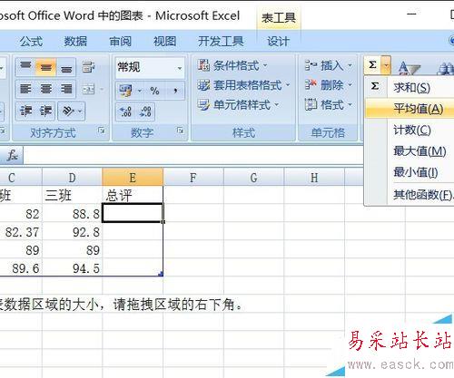 6、點擊總評下方單元格,在編輯欄的公式選項中選“平均值”。單元格中出現相應的函數,表示在此單元格中求此表此行一至三班總和的平均值。
