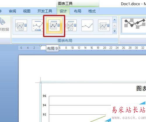 9、在圖表工具——設計中,為折線圖選擇一個滿意的布局,我選擇了布局9,這是一個帶數值標示和標題的布局。選擇后,每個數值自動出現在圖表中。如果預設的布局沒有滿意的,只有自己添加文本框來設計布局了。