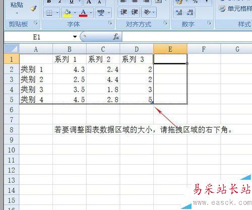 4、鼠標移至表格邊線右下角,會有一個雙向箭頭,按住向右拖動至下一列,會自動添加一列:系列4。
