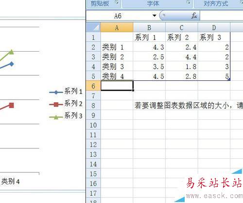 3、確定后,彈出折線圖與數據表。其中系列對應的是折線,類別對應的是折線中的數據,即折線中的關鍵點。本例中有三個班級和一個總評,所以,還需要添加一列。