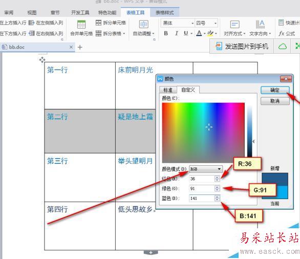 5、在彈出的對話窗口里,選擇“自定義”,看到“顏色樣式RGB”設(shè)置下面的顏色"紅色R:36","綠色G:91","藍色B:141",點擊"確定"按鈕就可以了。