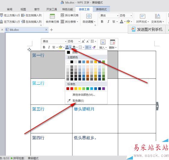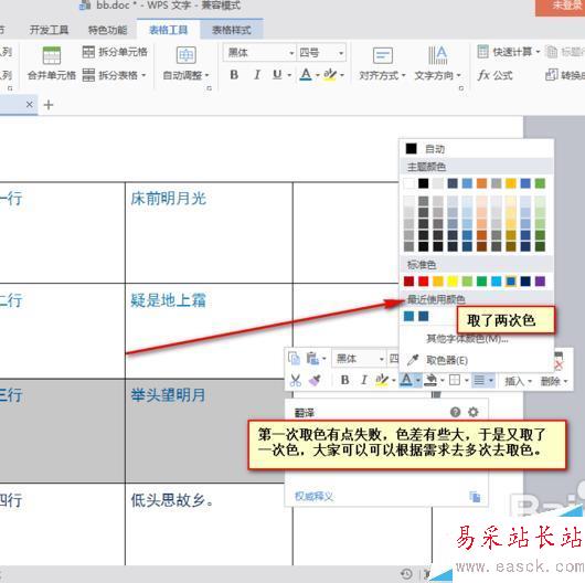 2、選中①顏色的字體,右鍵在“A”的右邊有一個下箭頭,點擊,彈出下拉列框,點擊取色器。