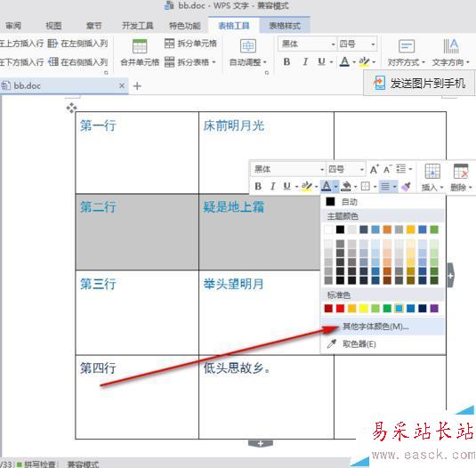 4、選中第二行的字體,右鍵在“A”的右邊有一個下箭頭,點擊,彈出下拉列框,點擊“其他字體顏色”