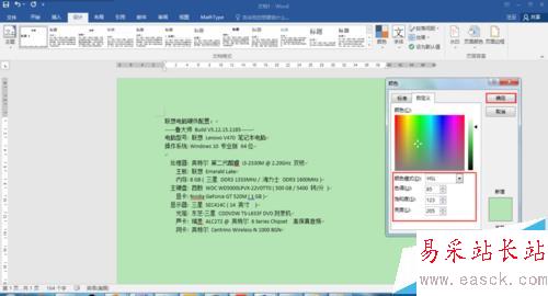 6、找到顏色模式,選擇HSL,然后將色調(diào)設(shè)為85,飽和度設(shè)為123,亮度設(shè)為205,然后單擊確定,就將白色的背景色改成了護(hù)眼綠了。