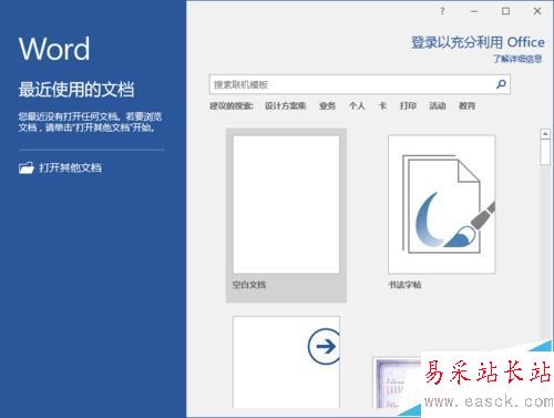 1、在計算機的Word2016程序圖標上雙擊鼠標左鍵,將其打開運行。在打開的Word程序界面,點擊“空白文檔”選項,新建一個空白的Word文檔。如圖所示;