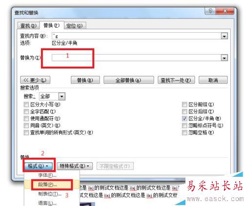 7、接下來,光標定位到“替換為”后面的空白處,在下面的“格式”命令中選擇“段落”。