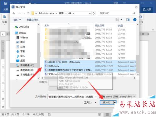 4、在“插入文件”對話窗口中,找到需要的插入的文檔的文件夾,并選中要插入的“文檔”,再點擊“插入”按鈕。如圖所示;