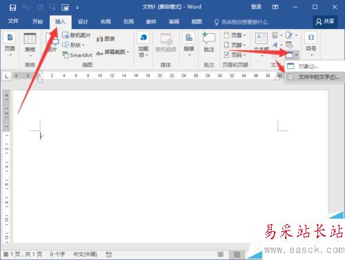 2、在打開的Word文檔窗口中,打開“插入”菜單選項卡,而后依次點擊“對象”-->“文件中的文字”命令選項。如圖所示;