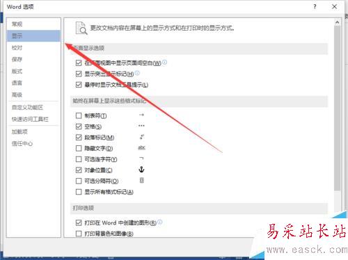 5、在彈出的“Word選項”對話框中,選擇并點擊“顯示”選項卡欄。如圖所示;